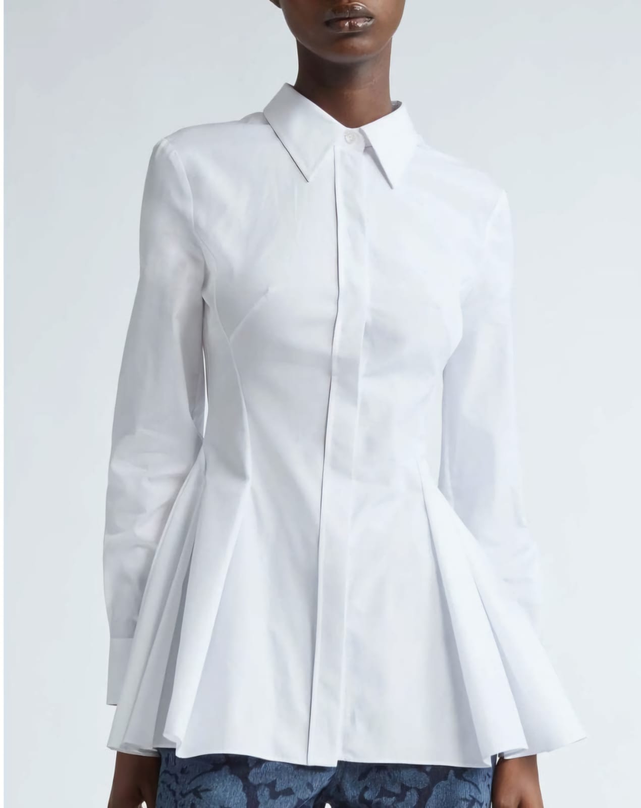 Descubra estilo e beleza com nossa camisa de manga longa, alongada com plepum e pregas. Uma peça que combina sofisticação e conforto.