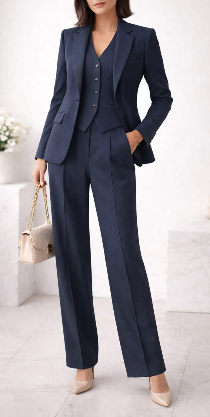 Conjunto composto por blazer estruturado, colete e calça de alfaiataria, com cortes e modelagem diferenciados que proporcionam conforto e caimento perfeitos no corpo. A escolha ideal para quem busca um visual sofisticado e de alta qualidade, com uma combinação de peças elegantes e atemporais.