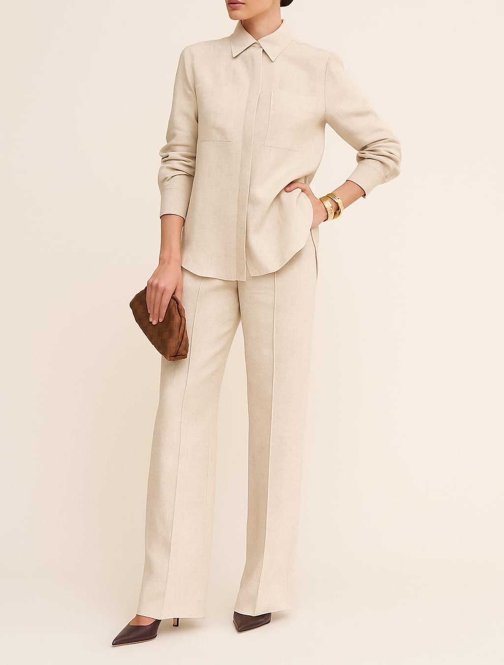 Adicione um toque de sofisticação e beleza ao seu guarda-roupa com nosso conjunto em linho puro. Composto de camisa manga longa com bolso dos dois lados e calça reta, este conjunto é produzido artesanalmente, elevando seu estilo com elegância.