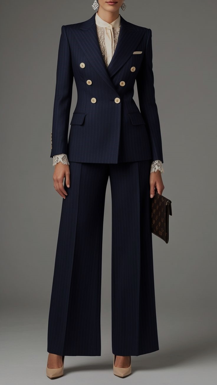 Adicione um toque de elegância ao seu guarda-roupa com este conjunto de blazer estruturado e calça alfaiataria risca de giz, projetado para oferecer conforto e um caimento impecável.